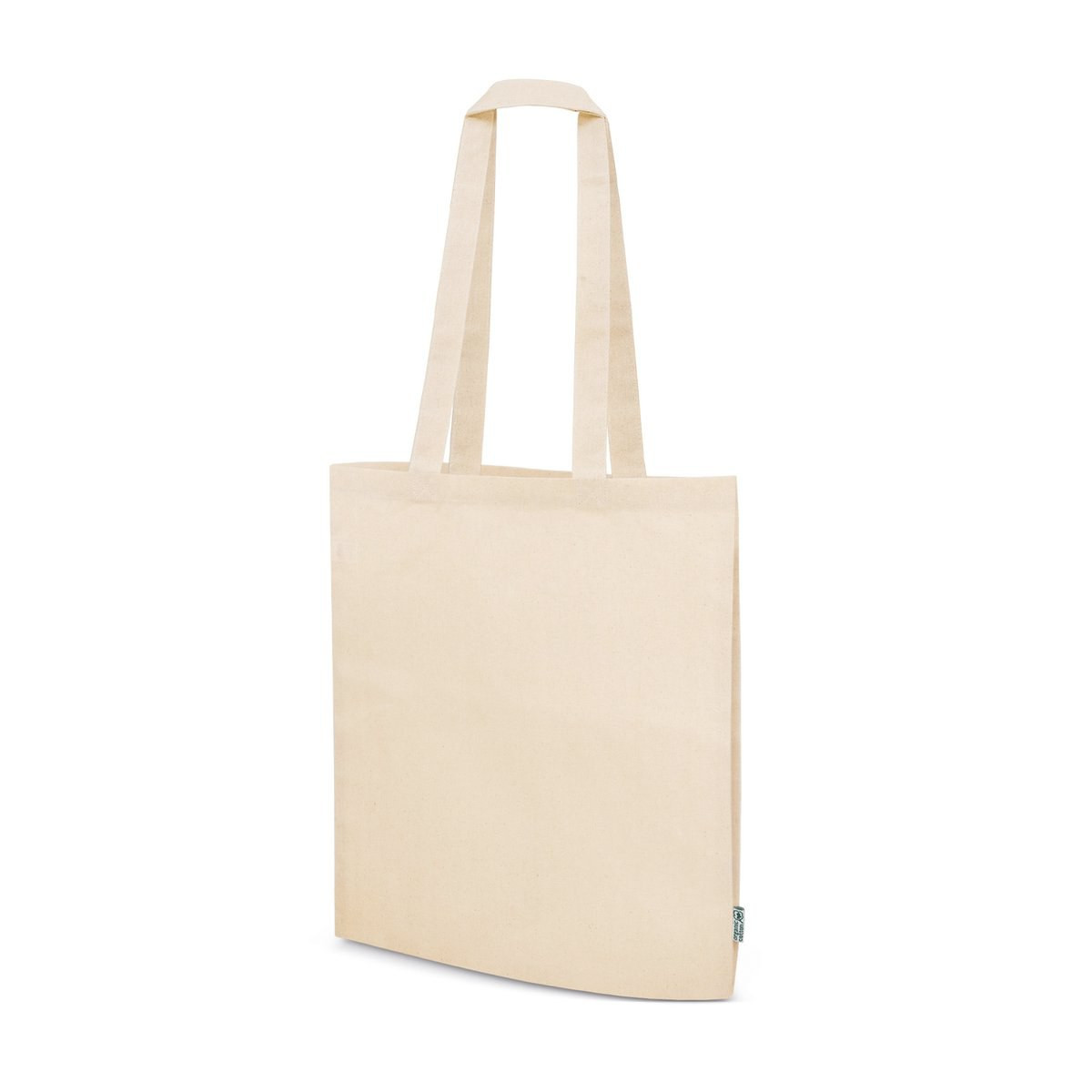 Sac shopping à longues anses, en coton biologique 140g/m2, certifié selon les normes GOTS (Global Organic Textile Standard). Comprend une étiquette extérieure avec la mention