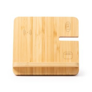 Le support de chargeur 3-en-1, fabriqué en bambou, offre une puissance de 15 W pour charger les smartphones, les smartwatches et les écouteurs sans fil.