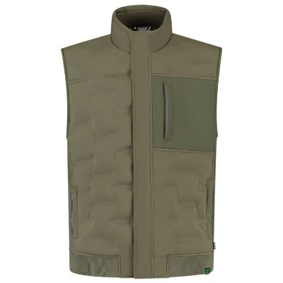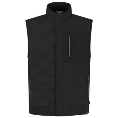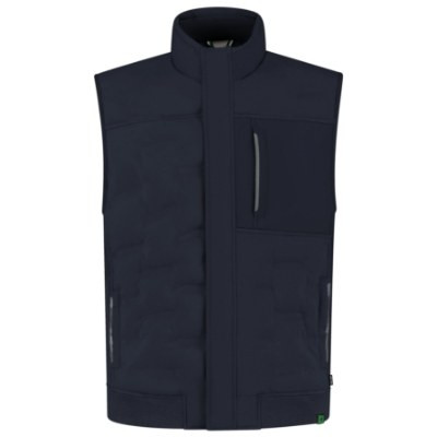 recycled polyester, wind-resistant and water-repellent fabric, modern puffer look, reflective print along the pocket entry and center back, straight cut with side seams, full-length zip with chin protection and storm flap lockable by concealed snaps, stand-up collar, sleeve lines slab-sided with an elastic strip, the left side  of the chest is made from softshell fabric, ready for possible printing, zipped chest pocket, with ID loop from inside, welt zip pockets, YYK zip pockets, access for branding, rib knit bottom hem, Tricorp item number: 402710